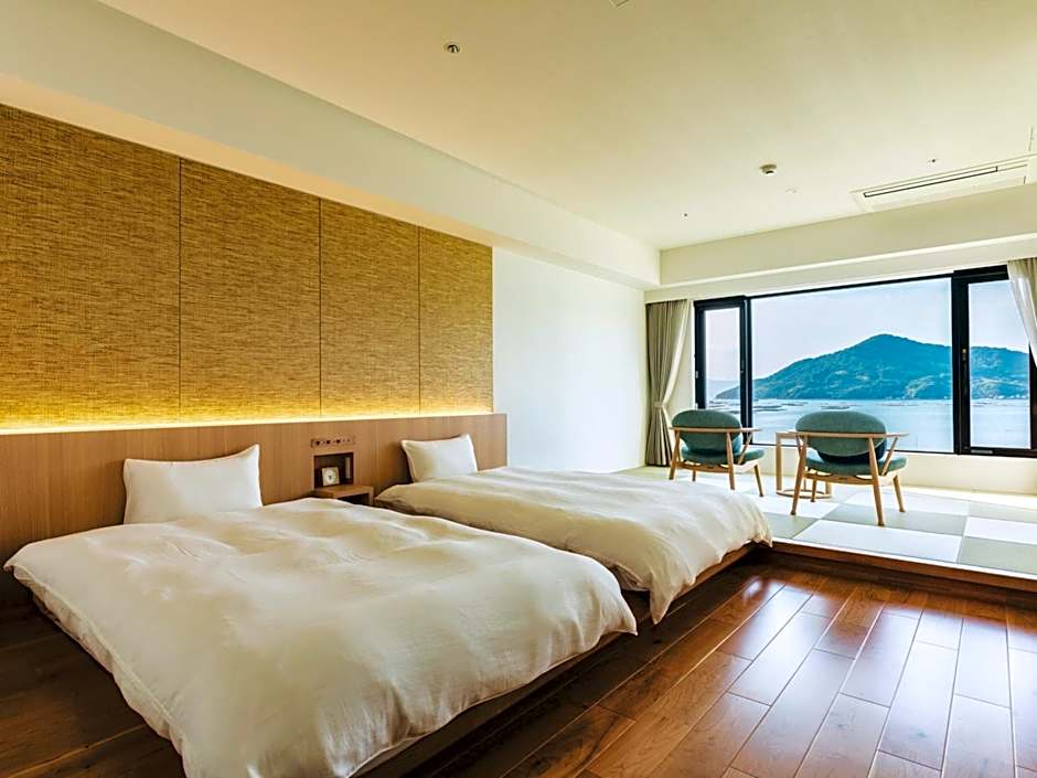 The spacious twin room offers air conditioning, tatami, a tea and coffee maker as well as a terrace with sea views. The unit has 2 beds.
