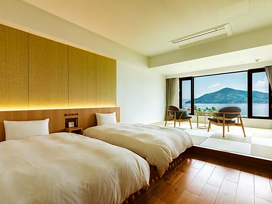 The spacious twin room offers air conditioning, tatami and sea views. The unit has 2 beds.